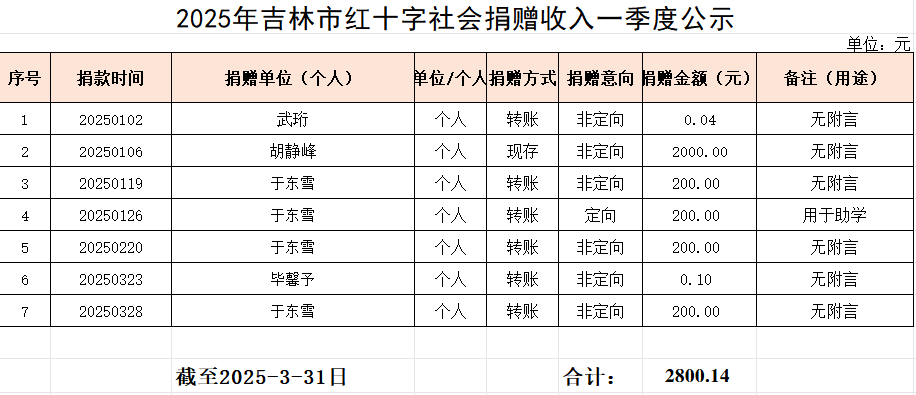 2025年一季度社会捐赠收入公示