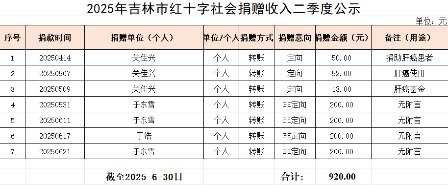 2025年二季度社会捐赠收入公示
